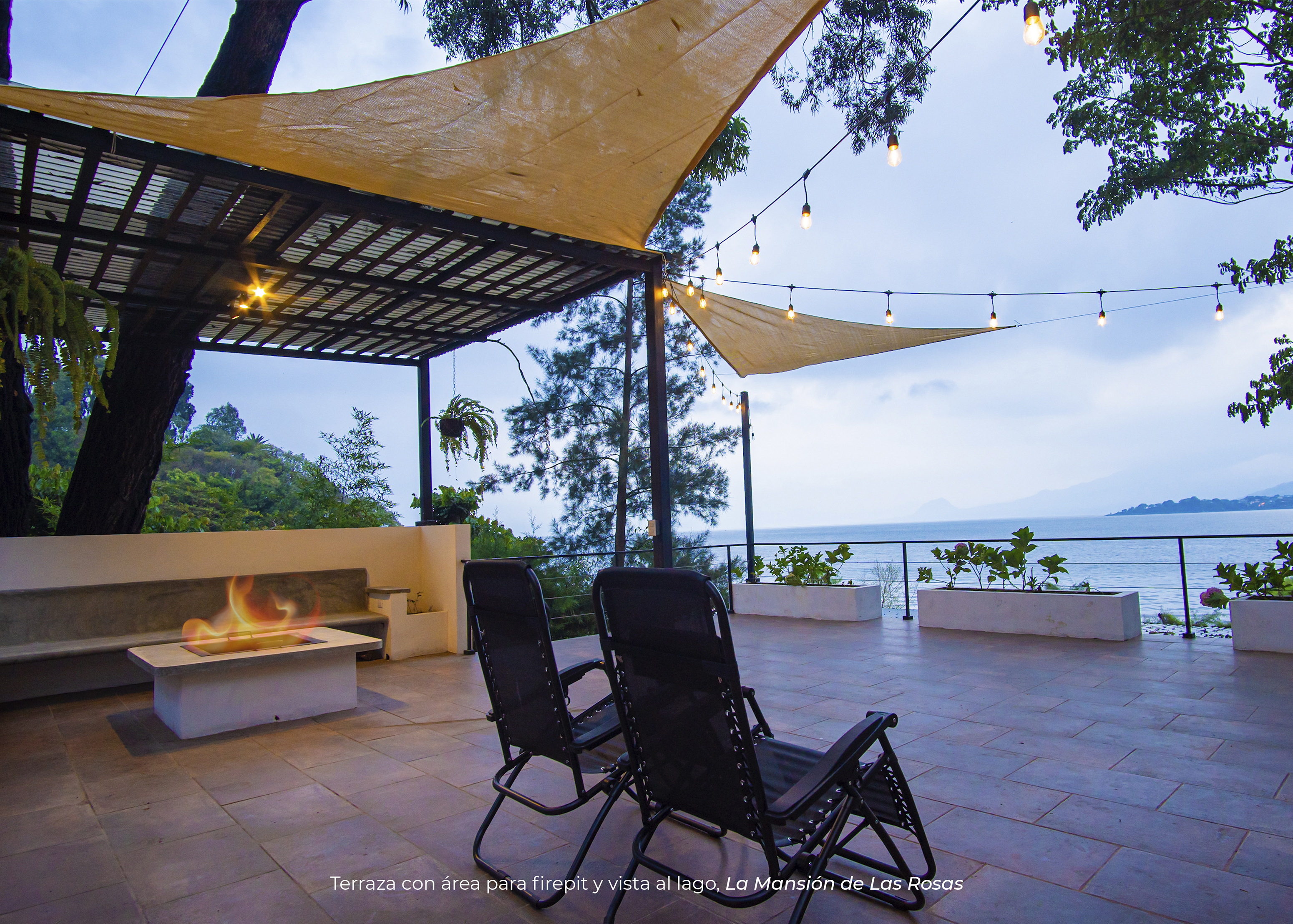 En el primer nivel, cuentas con dos habitaciones. Una de ellas con cama king y baño privado; y la otra habitación con 4 camas imperiales y baño; sala con televisor, comedor, cocina equipada, área para barbacoa y una pérgola con mesas, sillas en el segundo nivel con una vista espectacular al lago, sus volcanes y verdes alrededores.