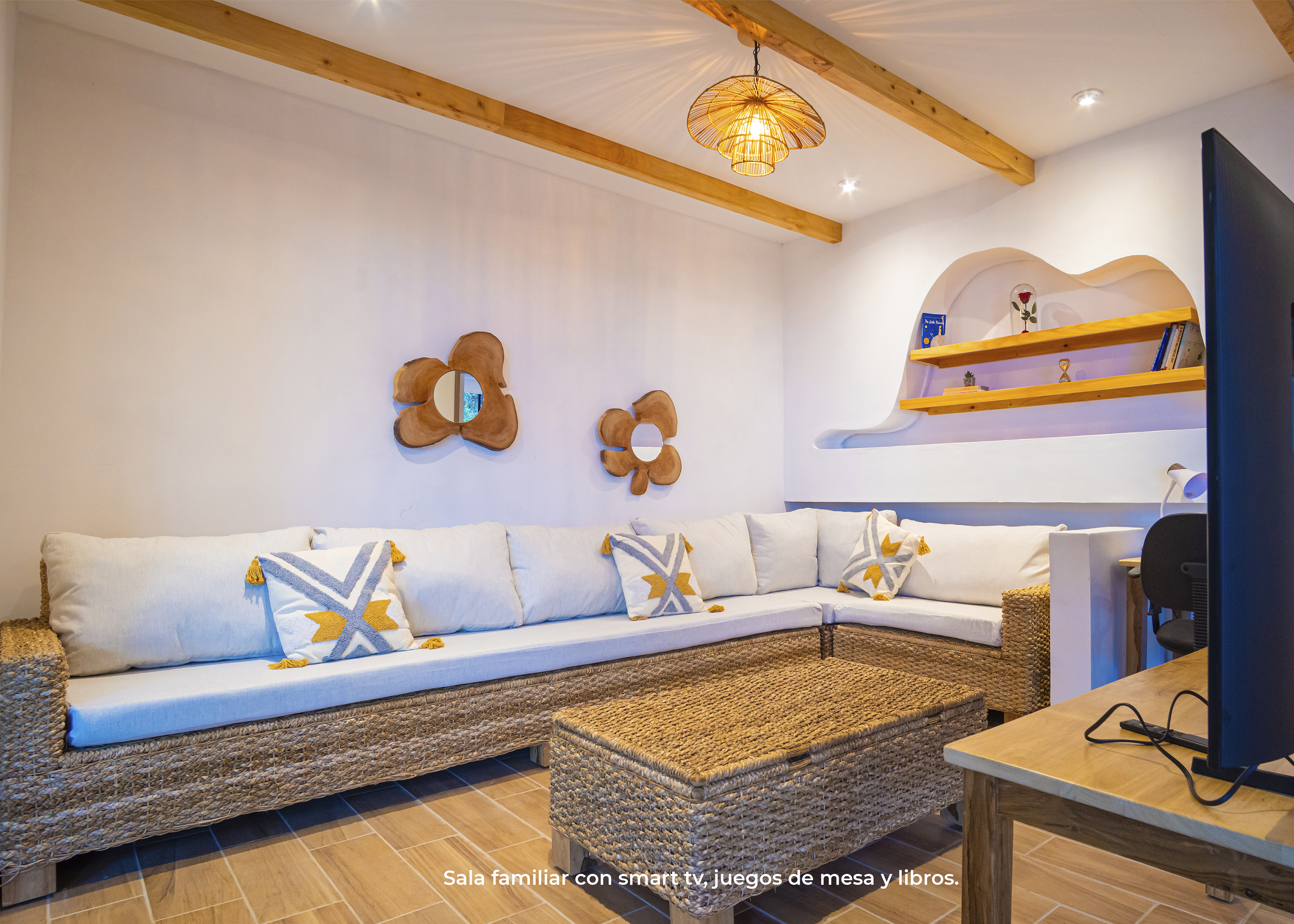 Esta casa es especial pues cuenta con un diseño único. Su techo de teja y detalles en madera crean un espacio cómodo y acogedor. Un espacio perfecto hasta para 7 personas.