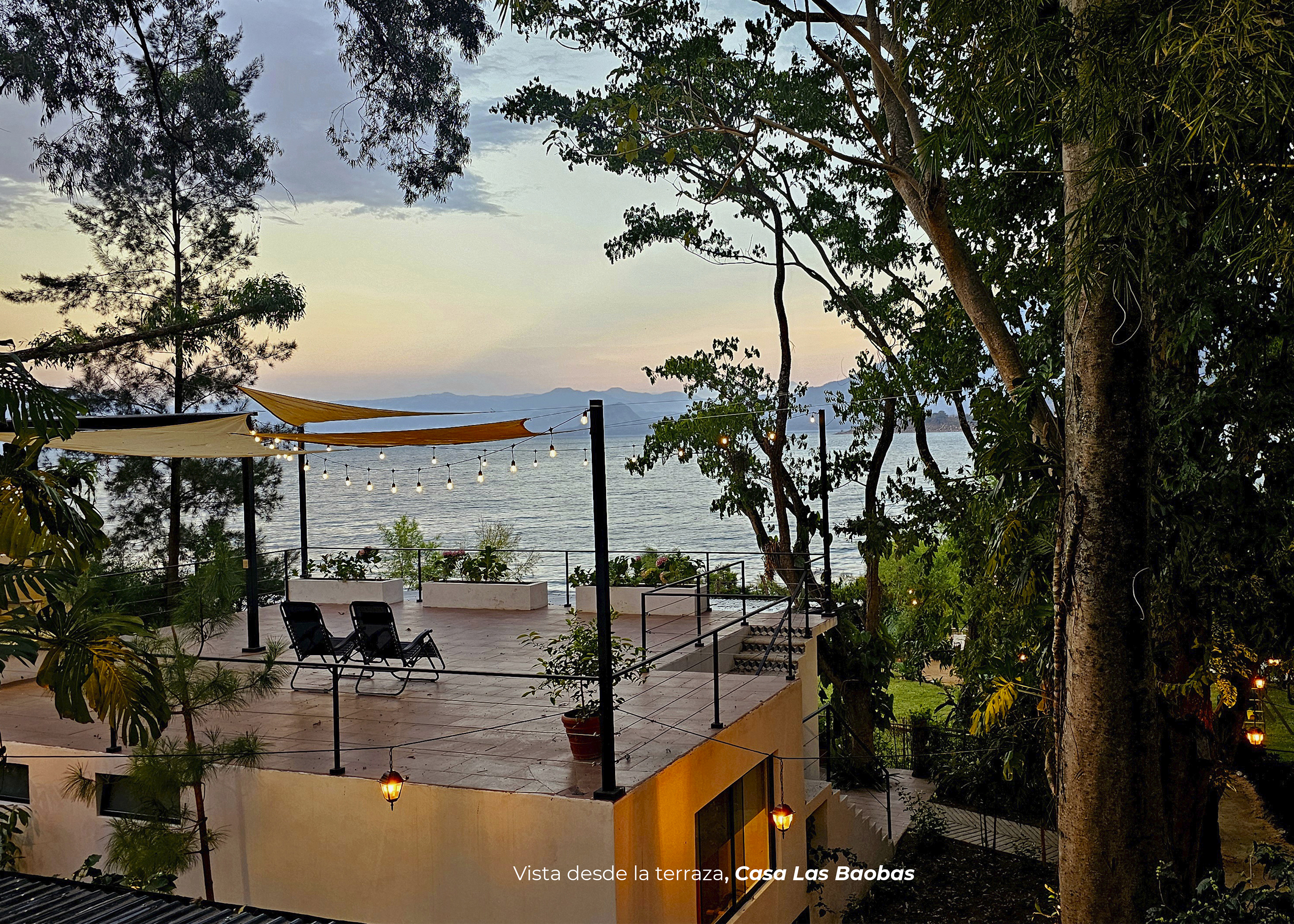 En el primer nivel, cuentas con dos habitaciones. Una de ellas con cama king y baño privado; y a otra habitación con 4 camas imperiales y baño; sala con televisor, comedor, cocina equipada, área para barbacoa y una pérgola con mesas, sillas en el segundo nivel con una vista espectacular al lago, sus volcanes y verdes alrededores.