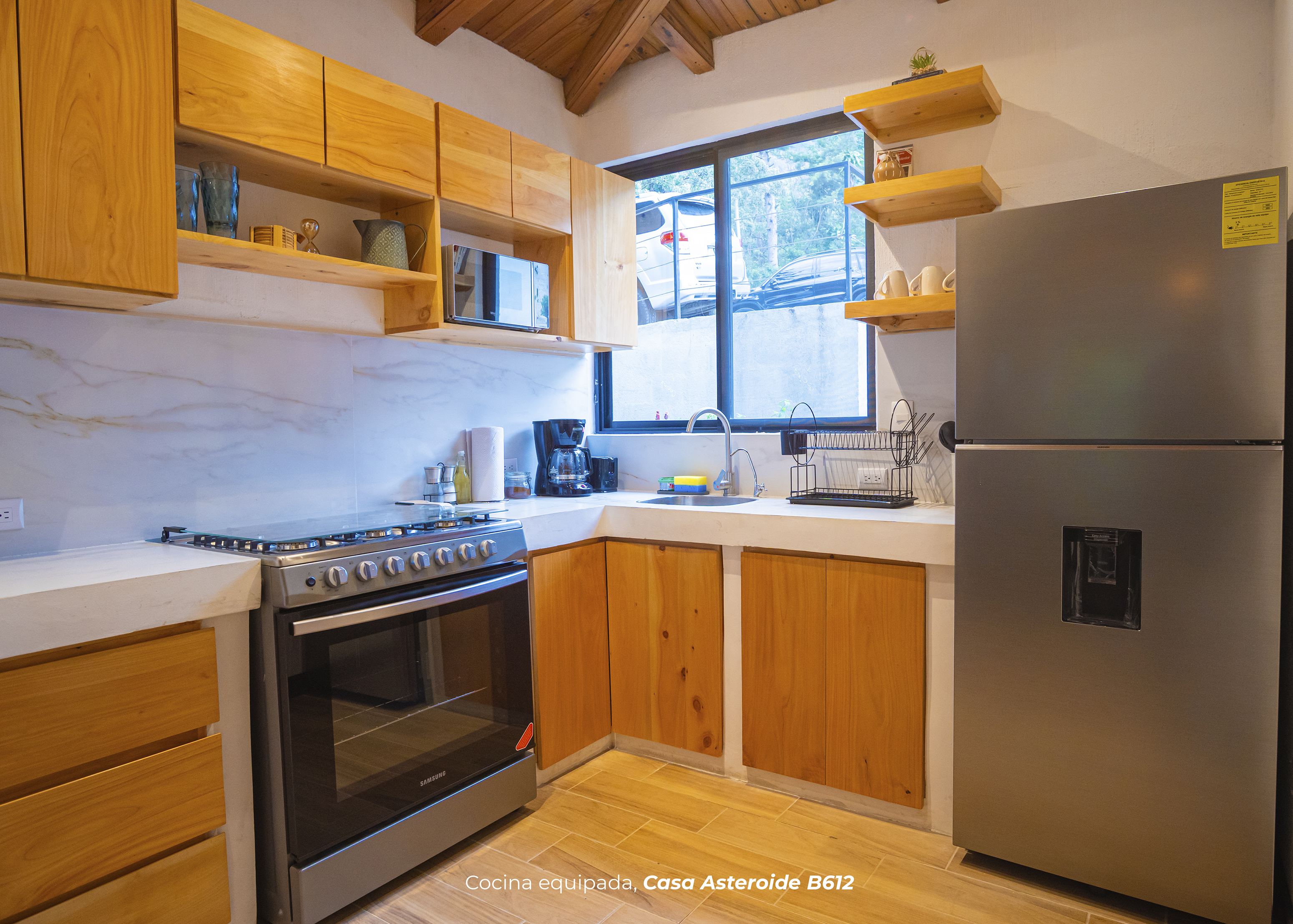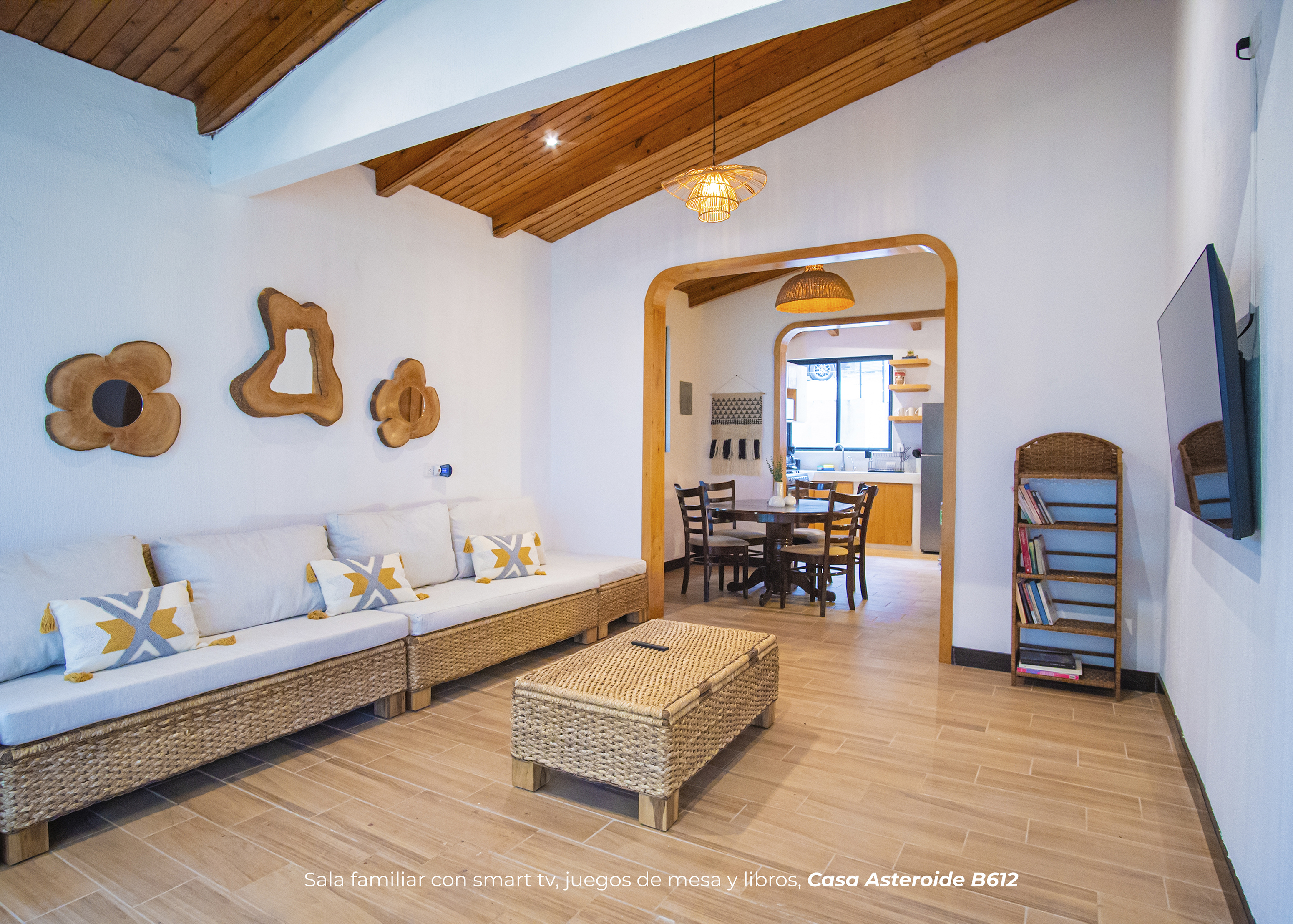 Cuenta con dos habitaciones. Una de ellas con cama king, sofá cama y baño privado. La otra habitación cuenta con 4 camas imperiales y baño. Sala con televisor, comedor, cocina equipada, área para barbacoa y firepit en medio de un hermoso jardín privado.